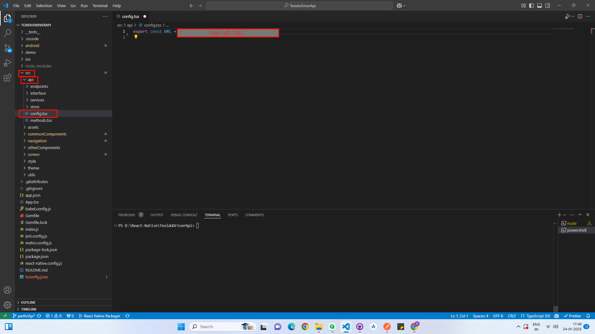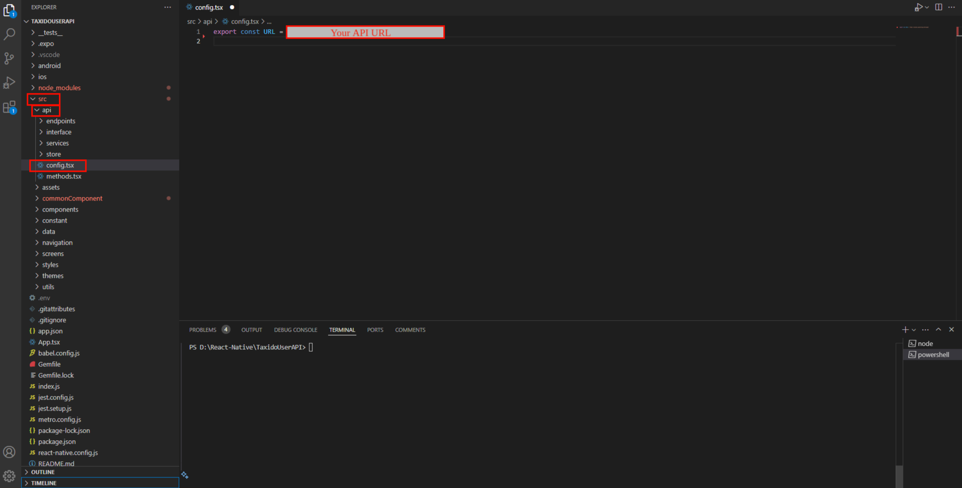 - Go to the api -> config.tsx file in the User & driver project to edit the API. Put your new URLs in place of the current api Url.