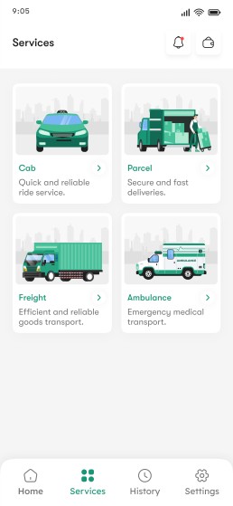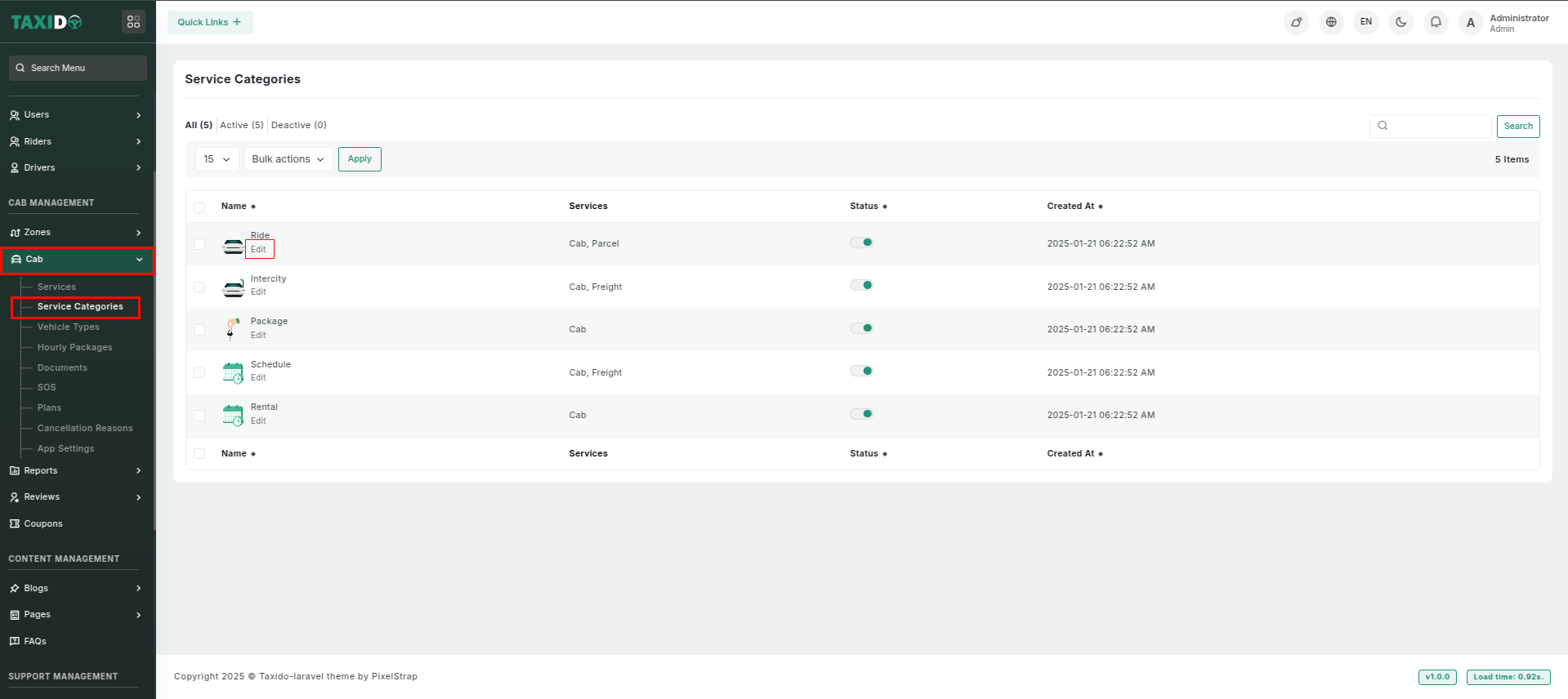 "Services Categories", where you will find options like Ride, Intercity, Package, Rental,