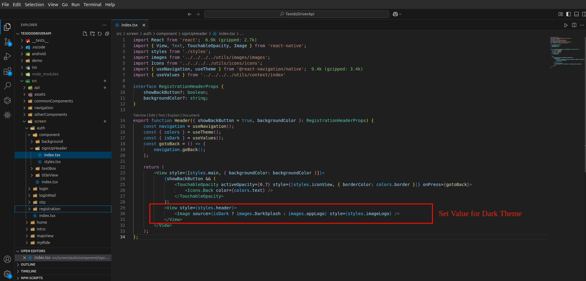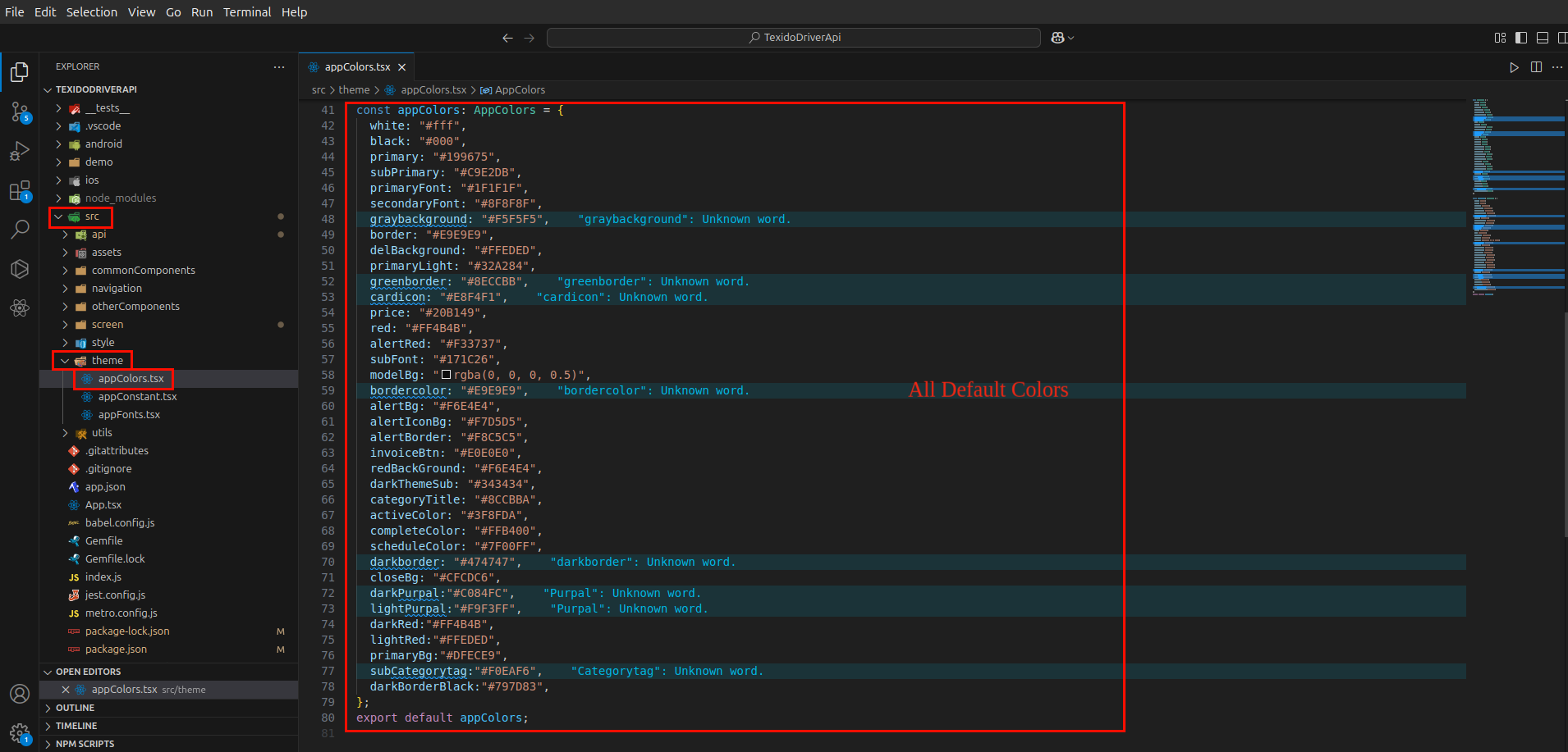 - Open your project Navigate to src/theme/appColors.tsx in you should already have a theme configuration file inside the src/theme/appColors.tsx that defines the color palette and styles for both dark and light modes. It may look something like appColors.tsx