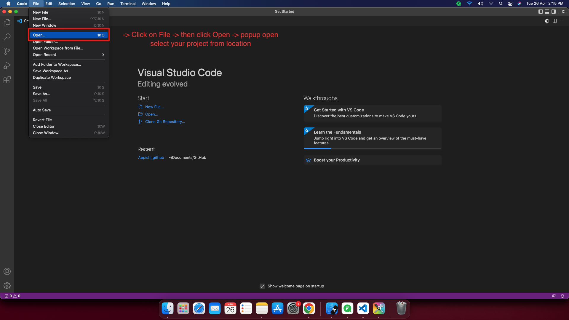 - Open your project now by selecting it from the directory under File -> Open.