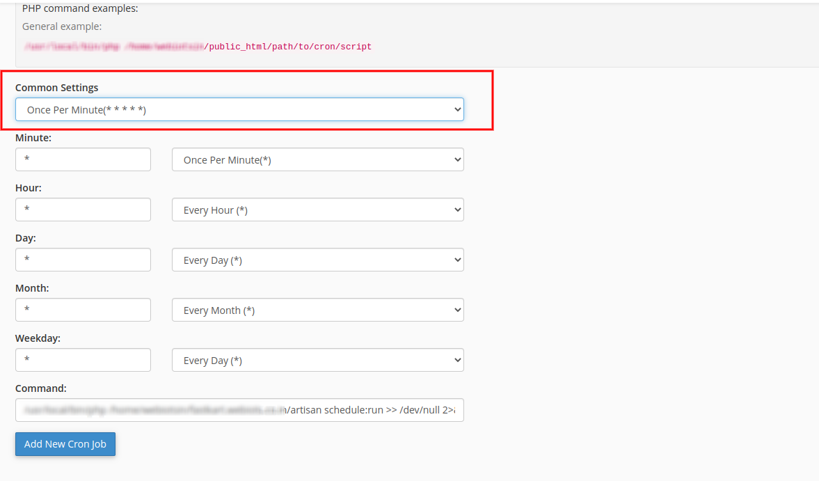 This should be run from the same API subdomain root folder (api.your-domain.com). - Click to Add New Cron Job Button, then add new cron job in cPanel.