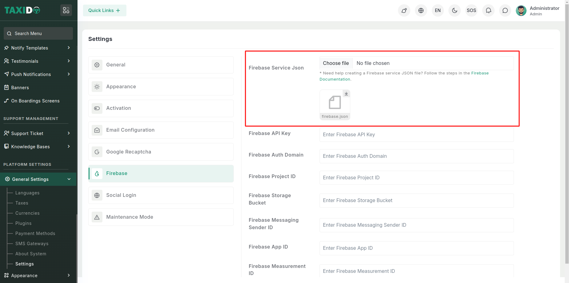 Once uploaded, the file will be saved to: public/admin/assets/firebase.json. The system will use this