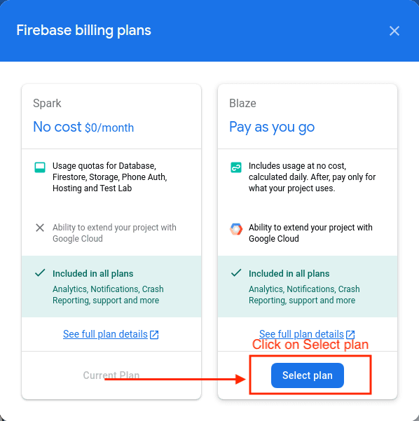 In that select plan Blaze just click on Select plan