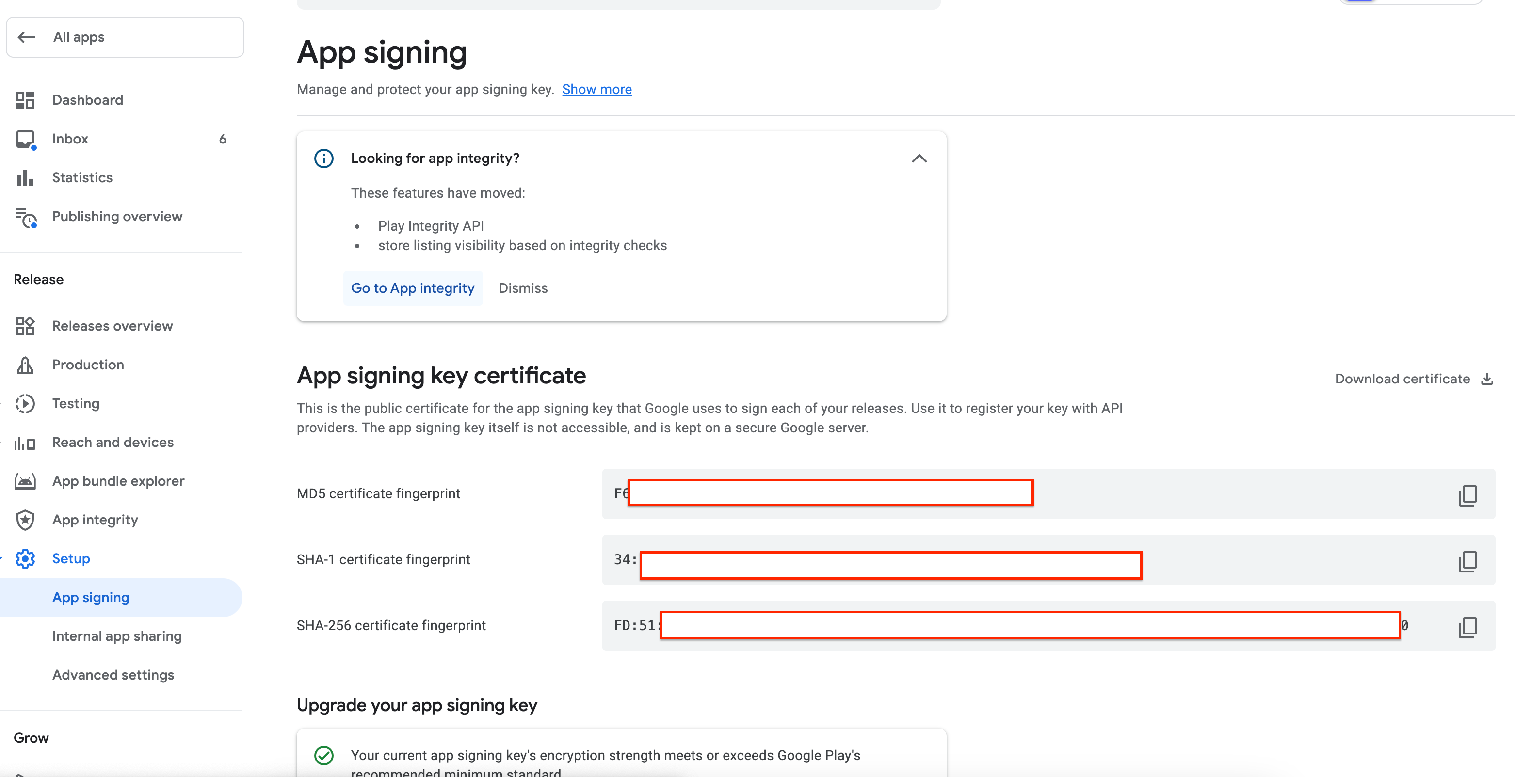 Go to Google play console ⇒ Select you app ⇒ Setup section [in left hand menu] ⇒ Click App Signin ⇒ Copy SHA-1 from app singin certificated and paste it to firebase project settings.