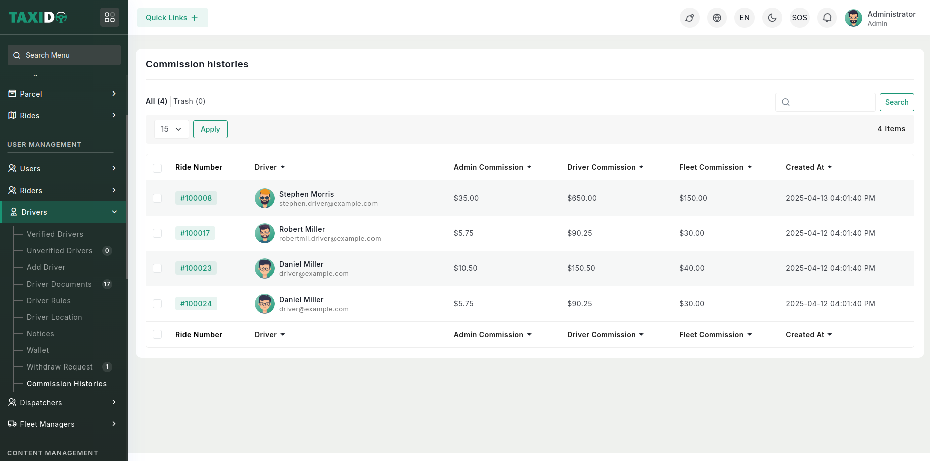This section ensures full transparency of commission distribution per ride.