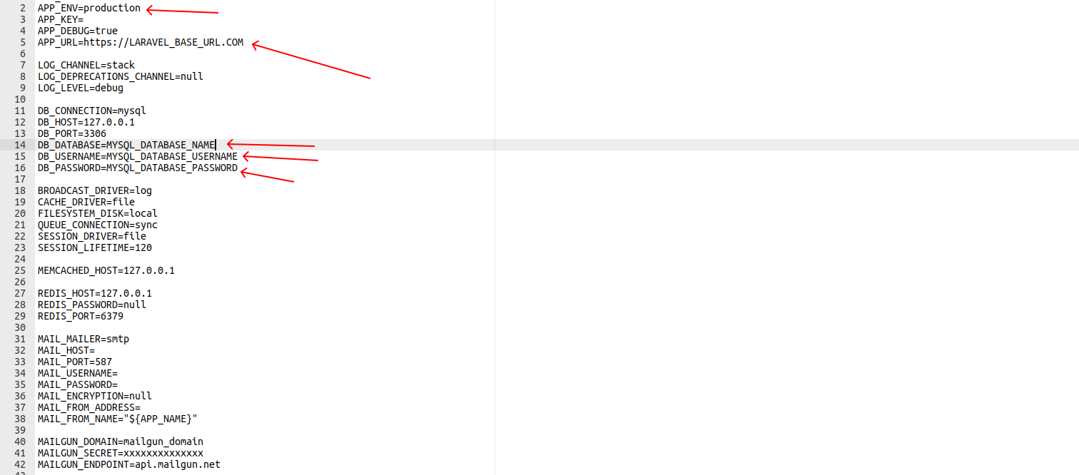 - Enter the essential MySQL database credentials to connect the Laravel API to the MySQL database such as a database host, username, password, and database name.