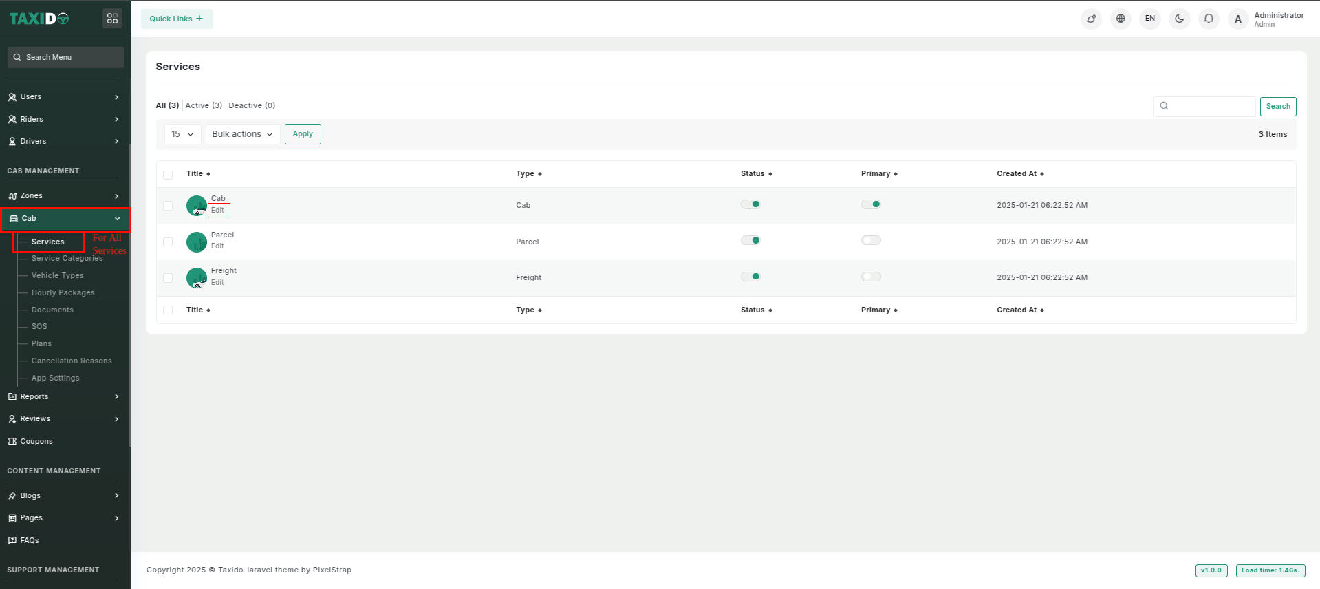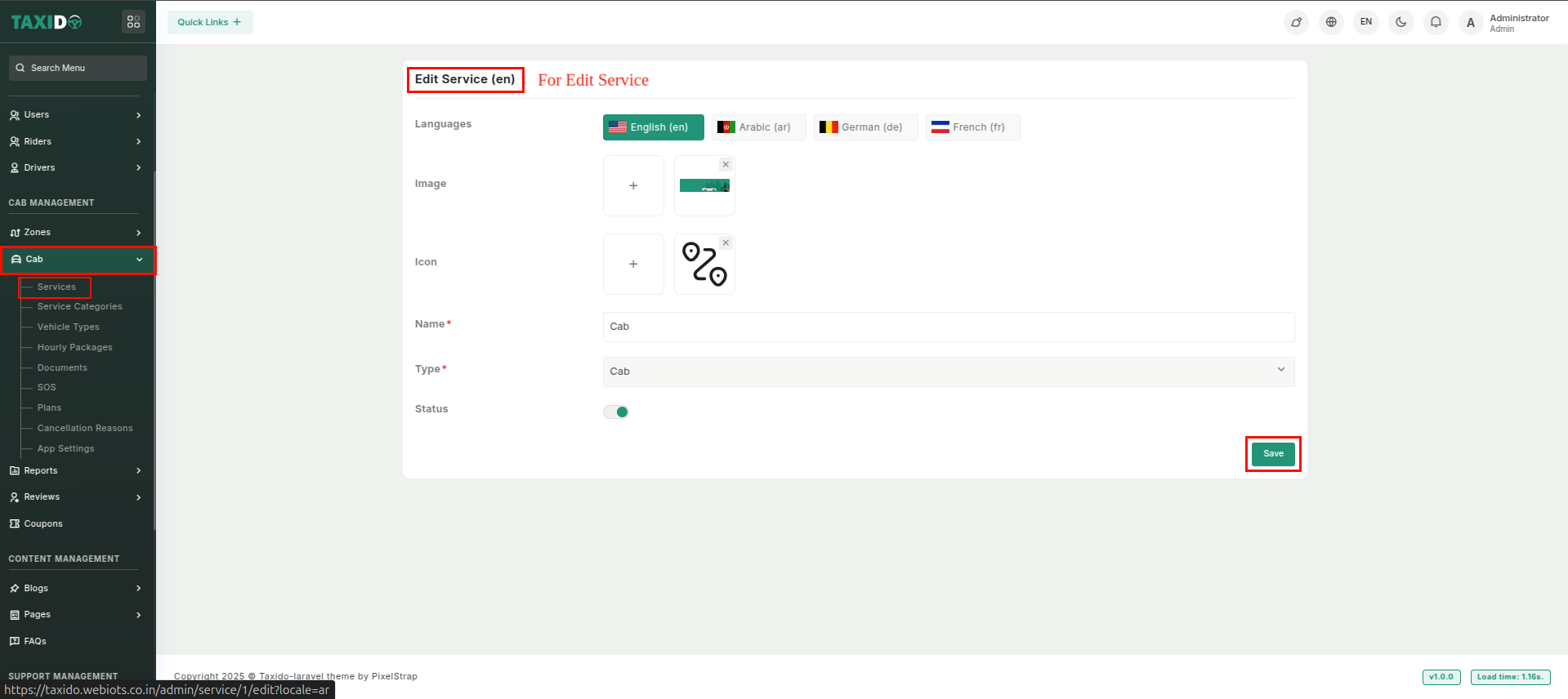 on the left-hand side menu, click on "Cab" and from the dropdown, select "Services".
