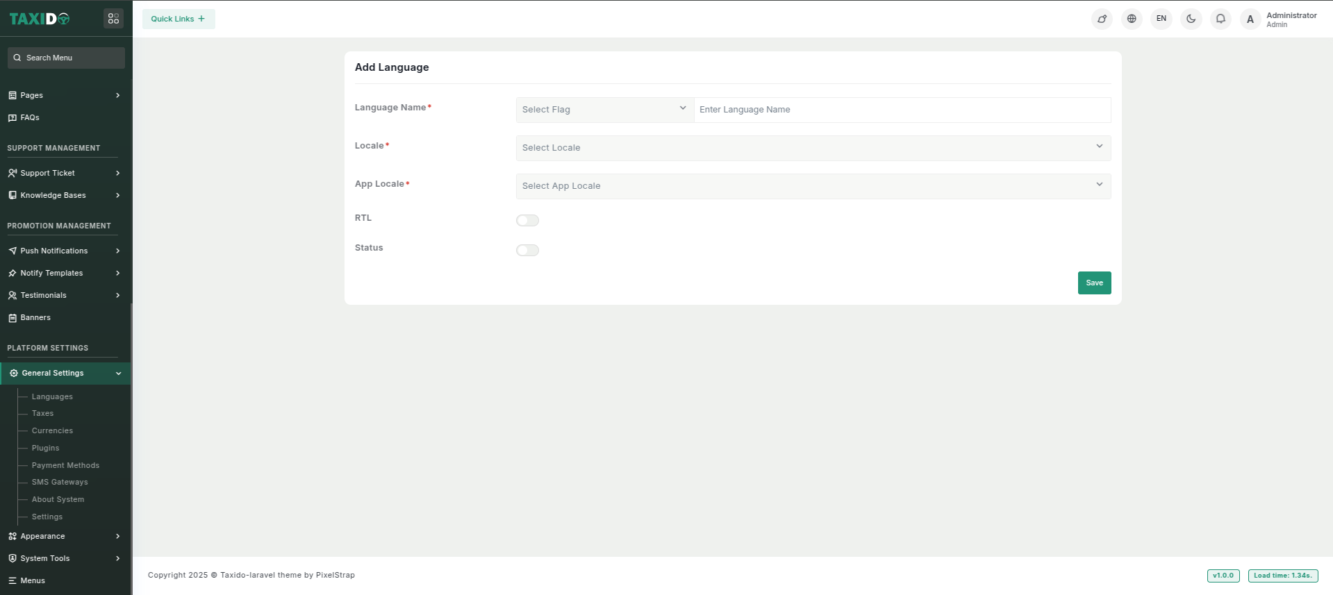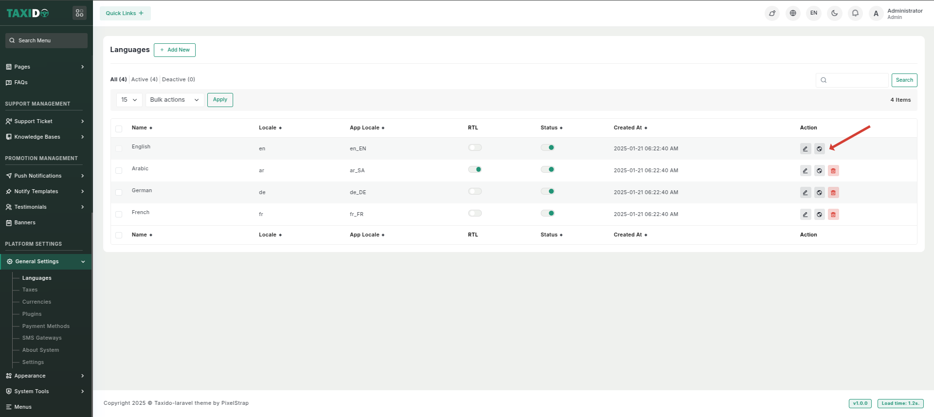 - Status: Toggle this option to activate or deactivate the language. If enabled, the language will be active in the system; if disabled, it will not be applied.