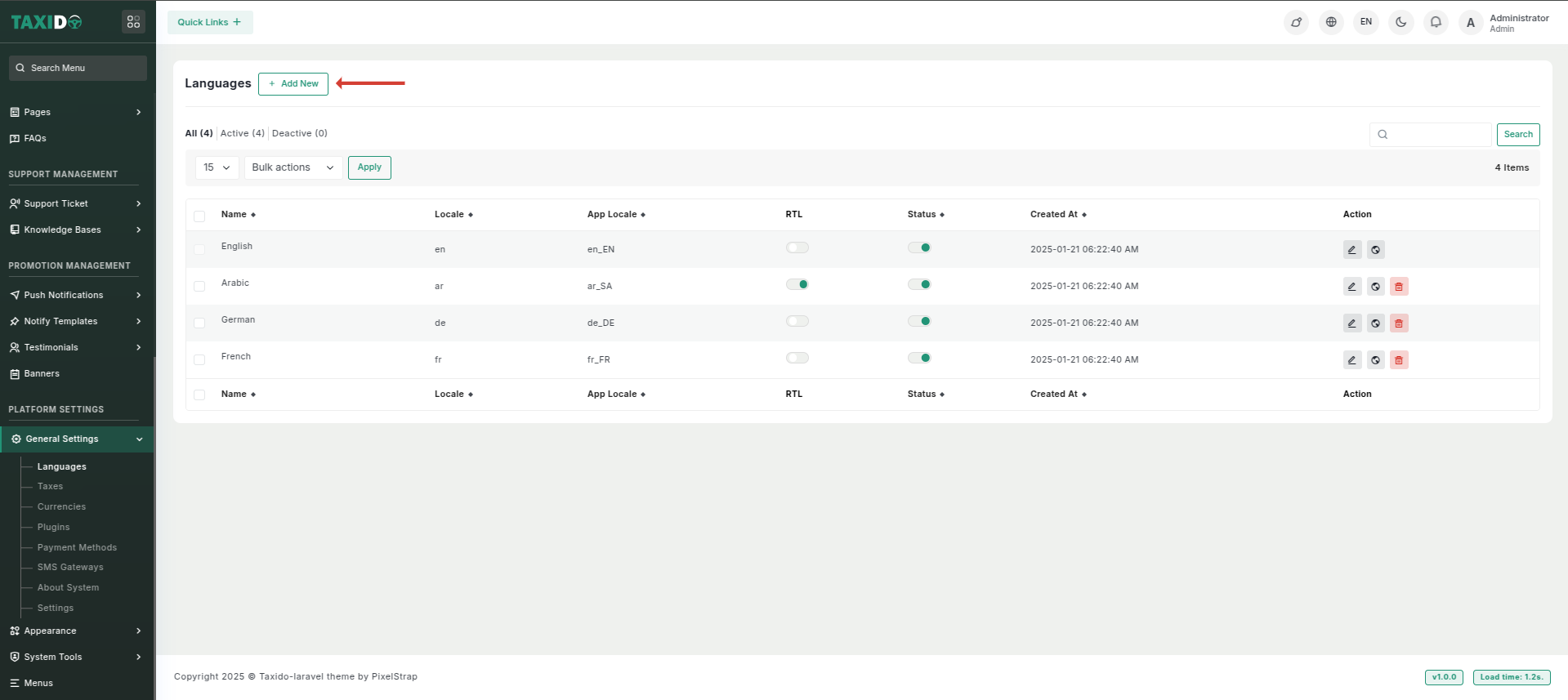 - Add New: The Add New button enables adding new languages to the website, enhancing localization and accessibility for users by expanding the available language options.