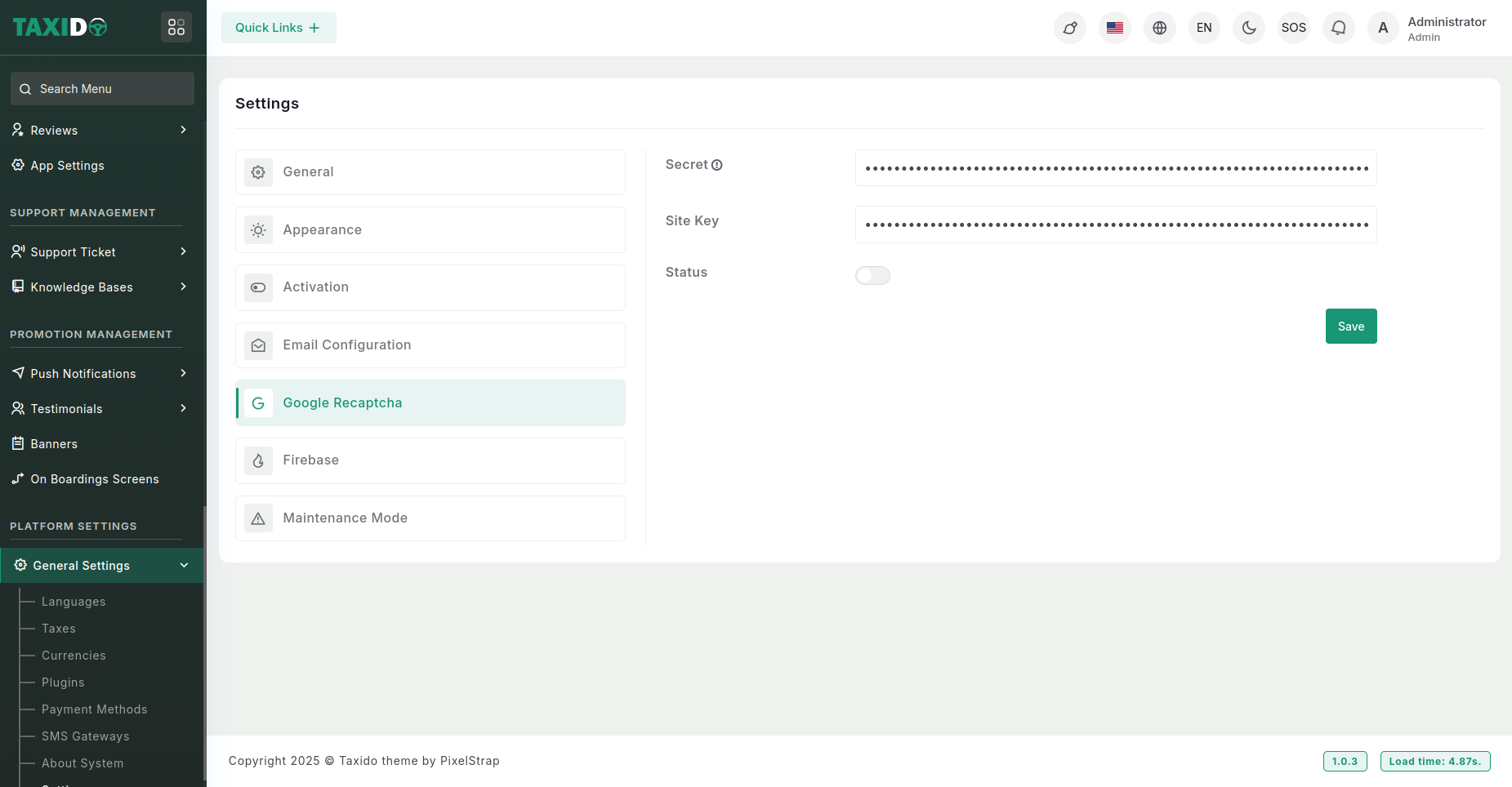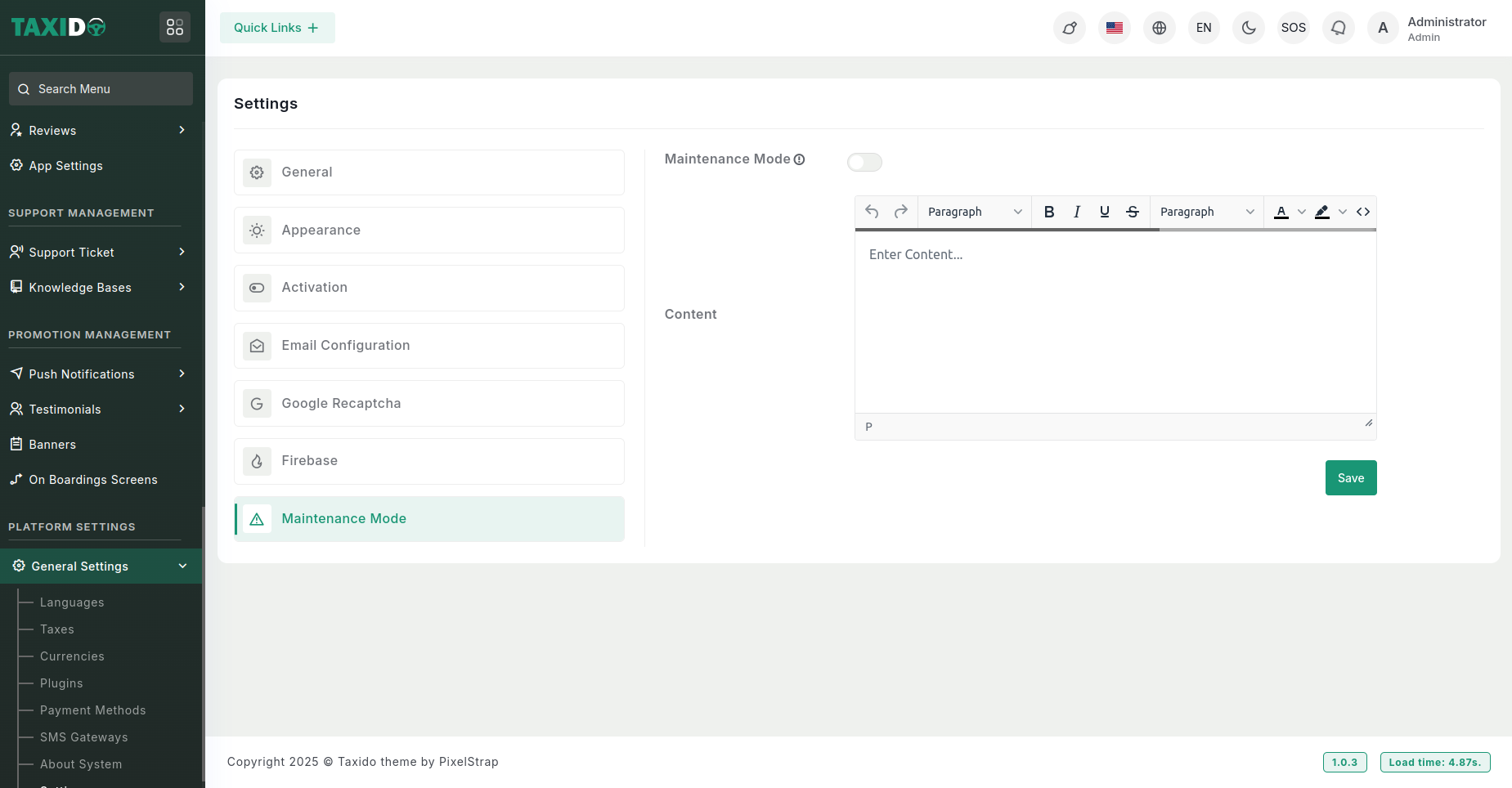 - Maintenance Mode: Toggle this option to activate or deactivate the maintenance mode. If enabled, the maintenance mode will be show in the landing page; if disabled, it will not be showed.