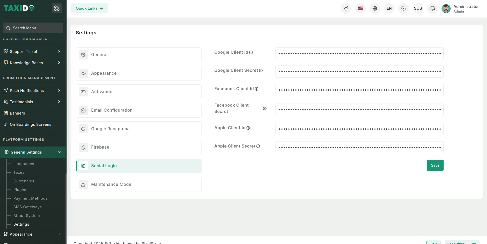 - In the "Social Login" tab, configure the required key details as shown in the provided screenshot. These keys allow integration with social login providers, enabling users to log in using their social media accounts.