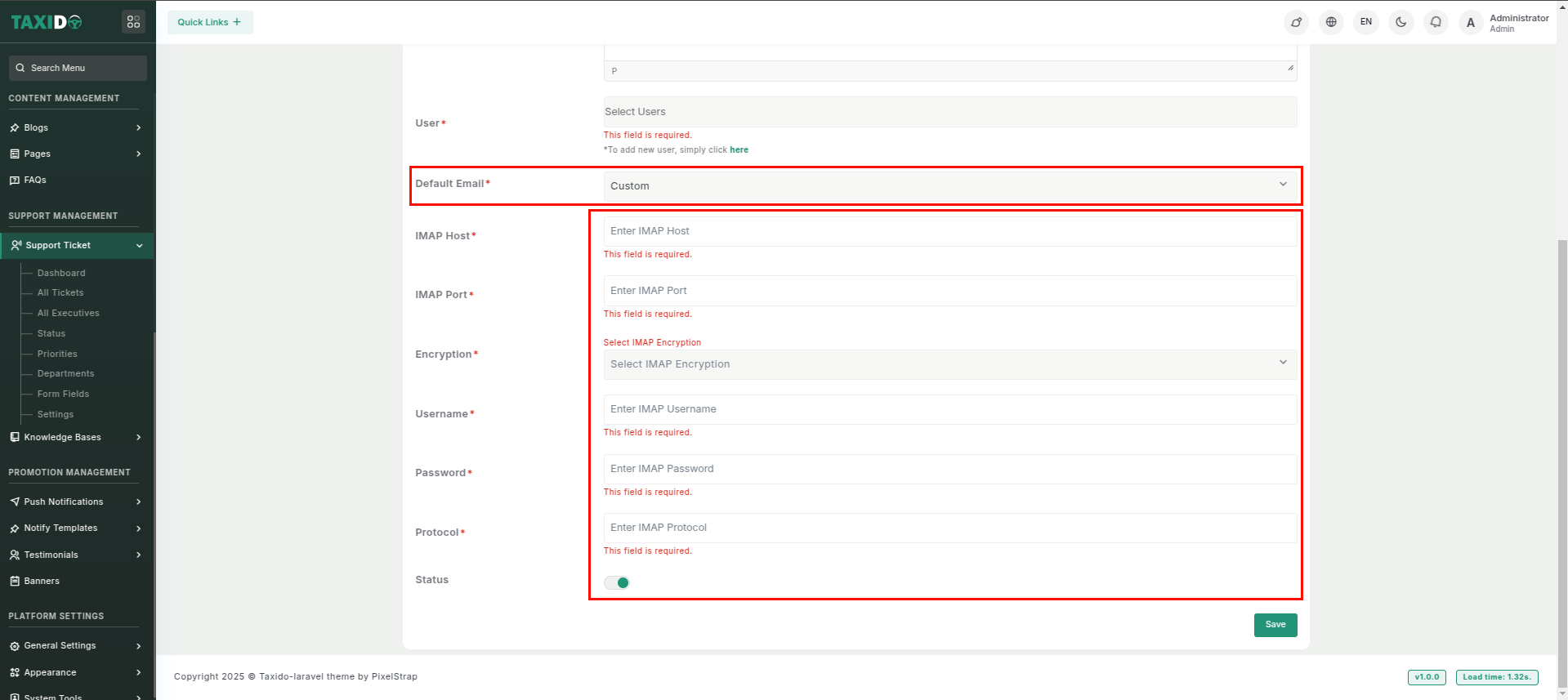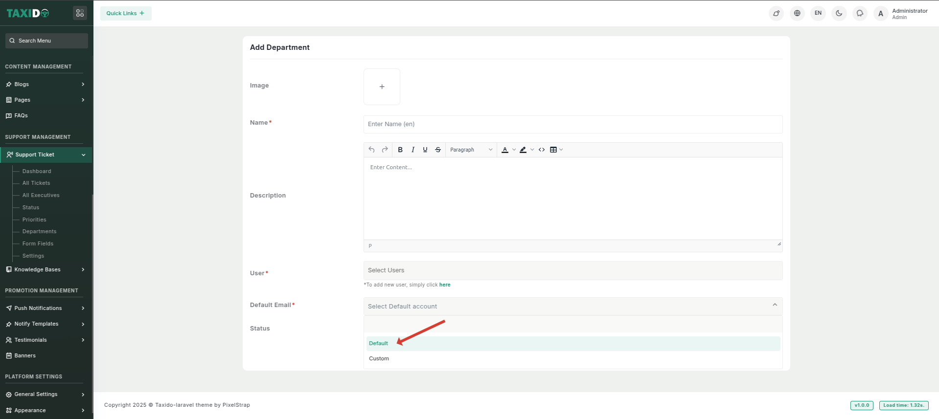 - Default Email: Select the default email option to use the system’s pre-configured email settings for fetching department-wise tickets. If you choose 'Custom,' you’ll need to enter your own email configuration for this department.