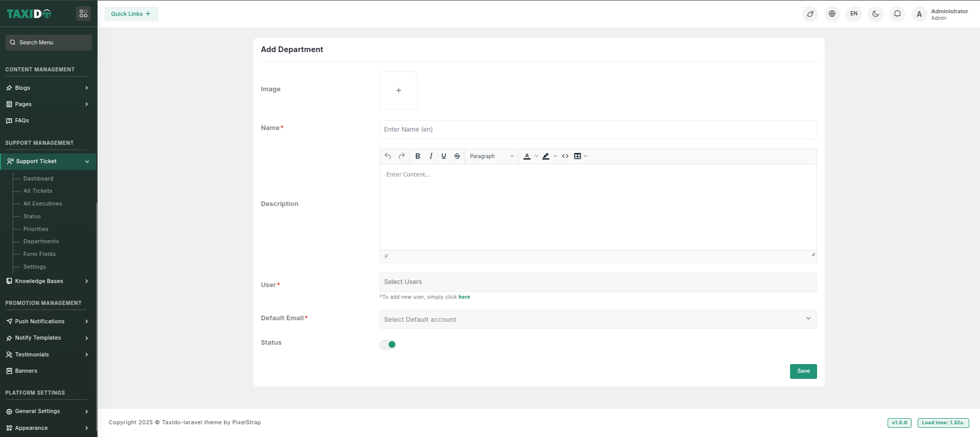 - Status: Set the status to either "Active" or "Inactive." If the status is "Active," this department is available storing ticket department wise. If "Inactive," it will not be available for use.