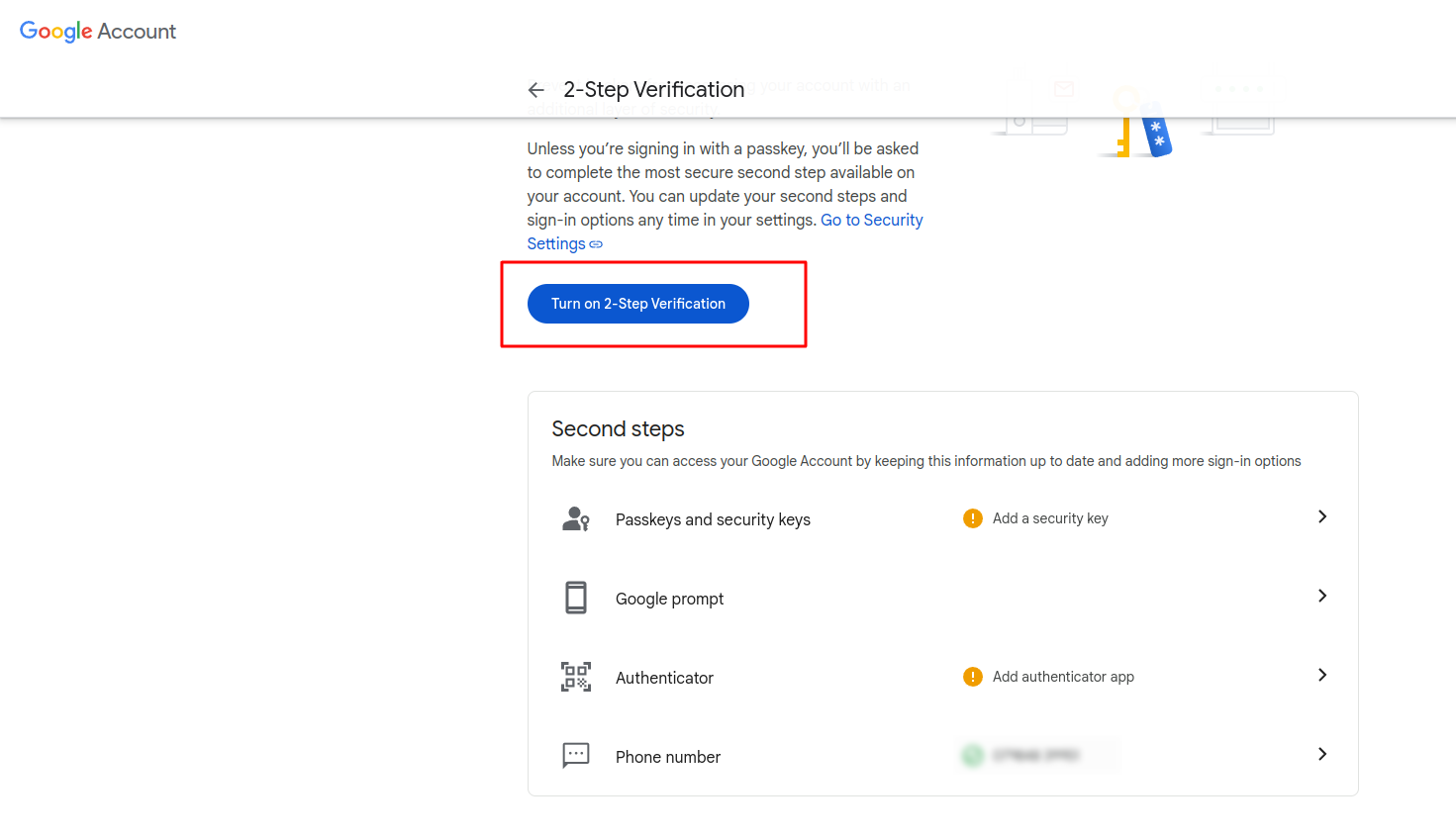 - Click Turn on 2-Step Verification and verify account by option given