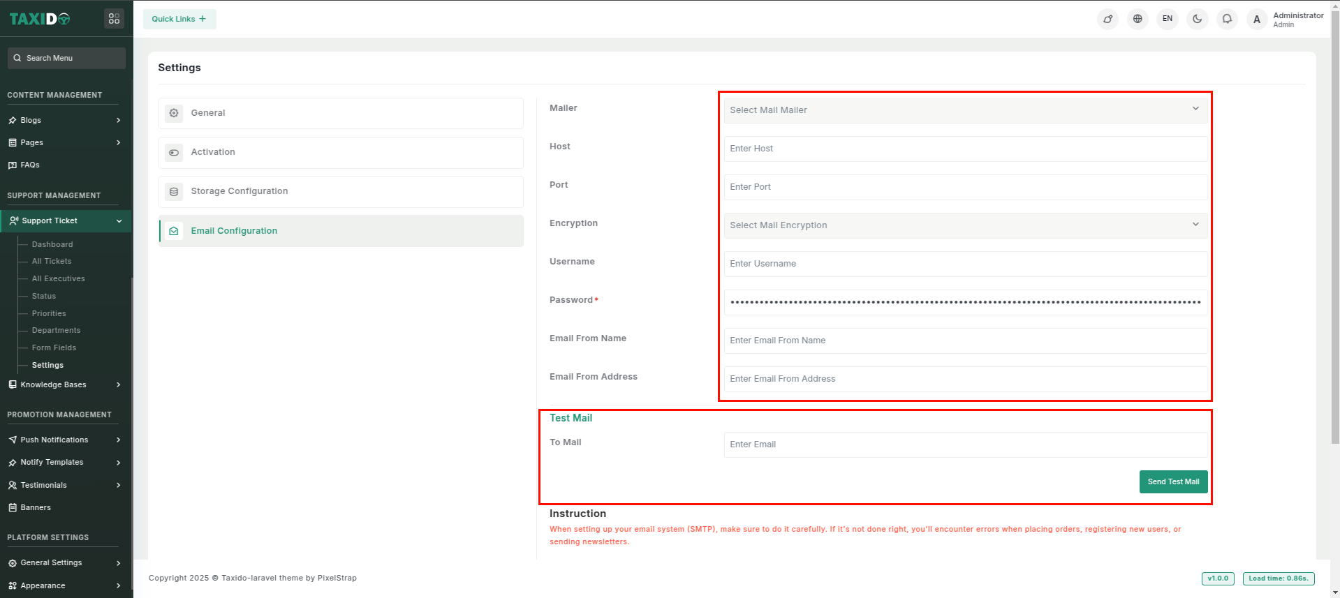 To receive the email, simply press the 'Send Test Mail' button.