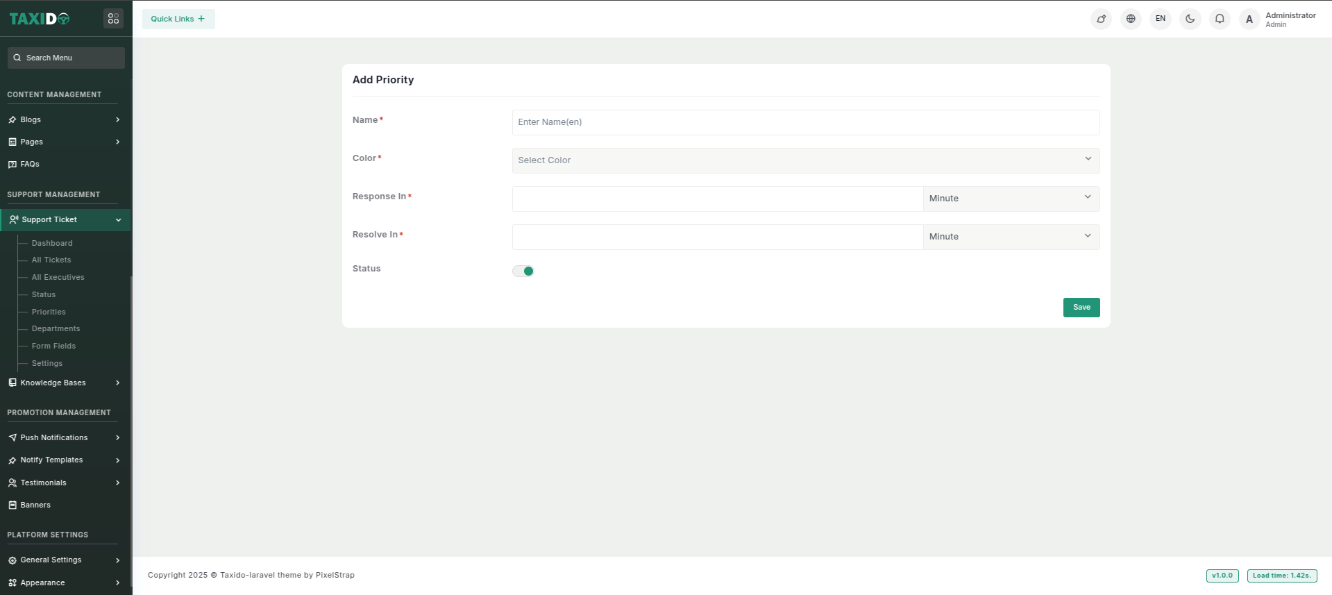 - Status: Set the status to either "Active" or "Inactive." If the status is "Active," this priority is available in ticket creation. If "Inactive," it will not be available for use.