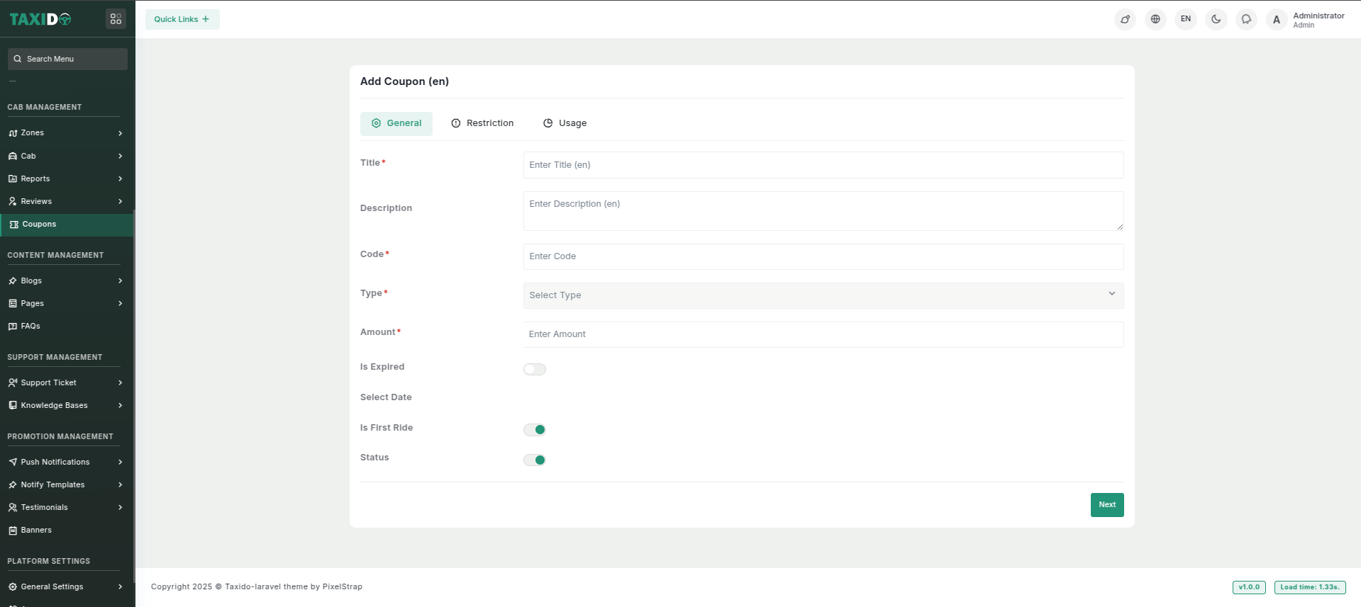 On the admin sidebar, find and click on the Coupons which available on "Cab Management".