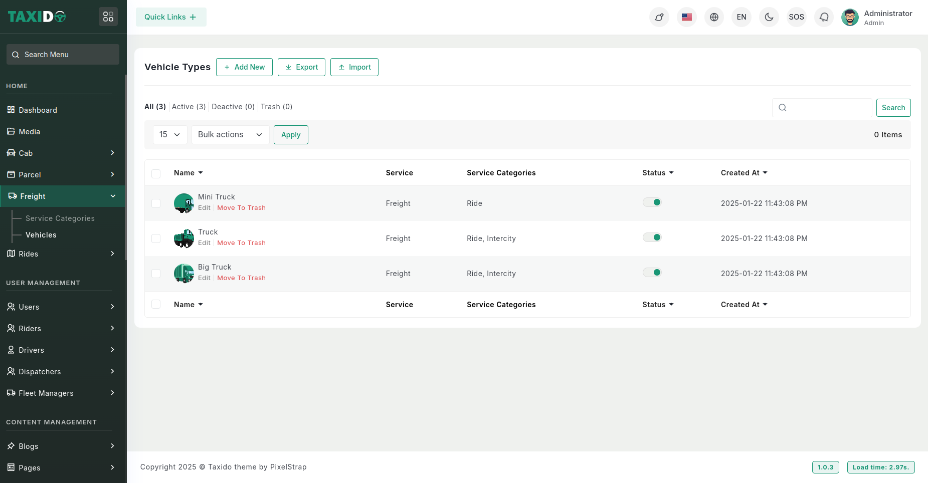 - Add New: The button allows you to create a new vehicle type by entering relevant details such as name, image, charge settings, commissions, and additional info. It provides an easy way to expand the list of vehicle types in the system.