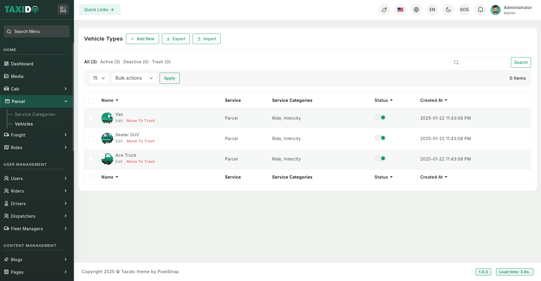 The system supports multiple services such as Cab, Freight, and Parcel, each of which can be further categorized into service categories like Ride, Intercity, Package, Schedule, and Rental. Vehicle types are assigned to these services and categories to determine their operational scope and pricing structure.