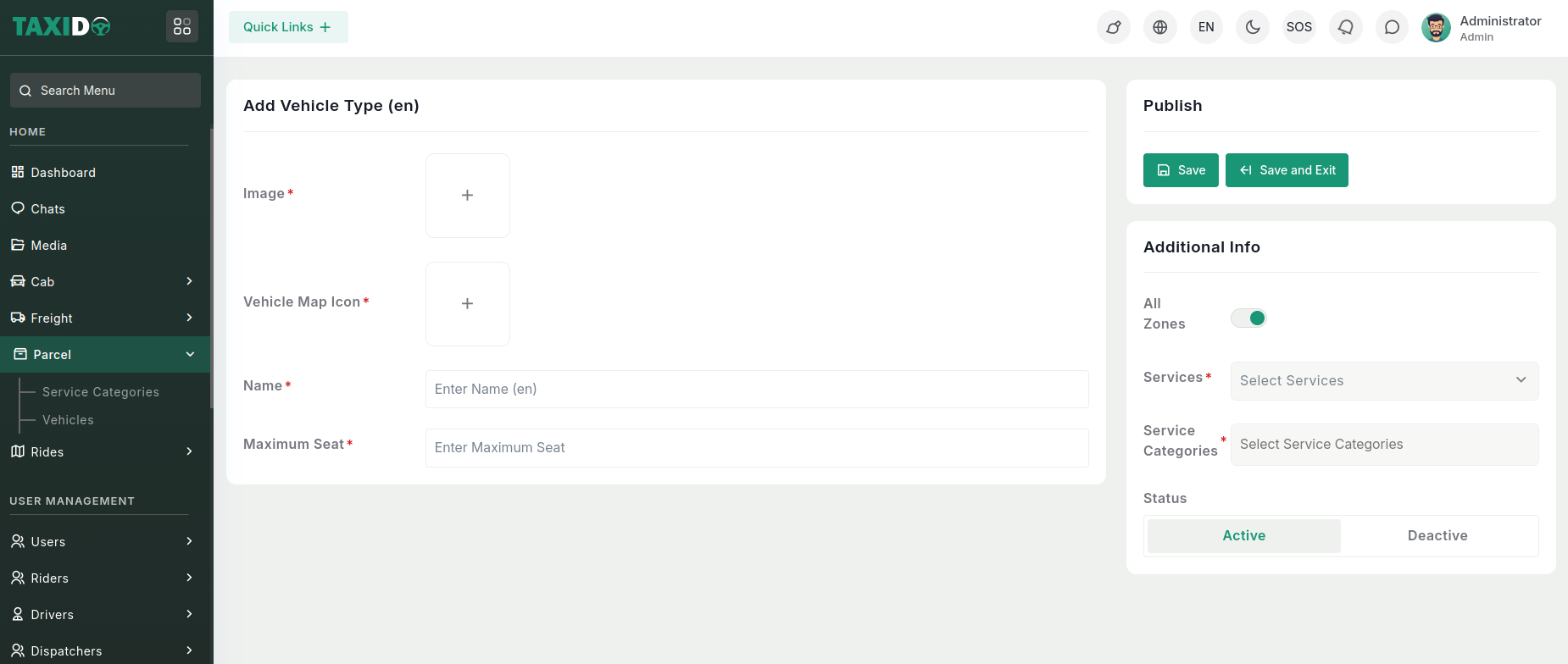 - Service Categories: Select the service categories this vehicle type supports. Categories could include Ride, Intercity, Package, Schedule, or Rental services, depending on the type of service this vehicle is used for.