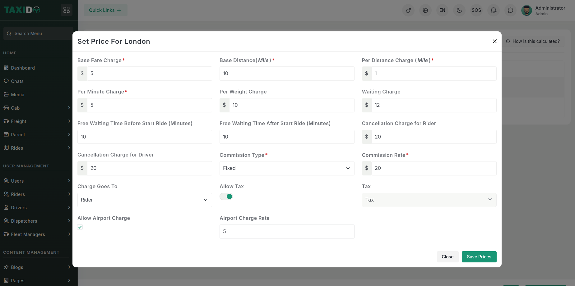 - Tax - Tax rate or amount to be applied to the fare.