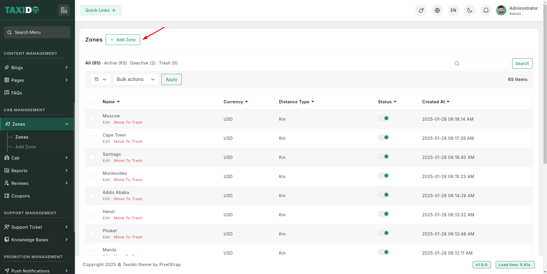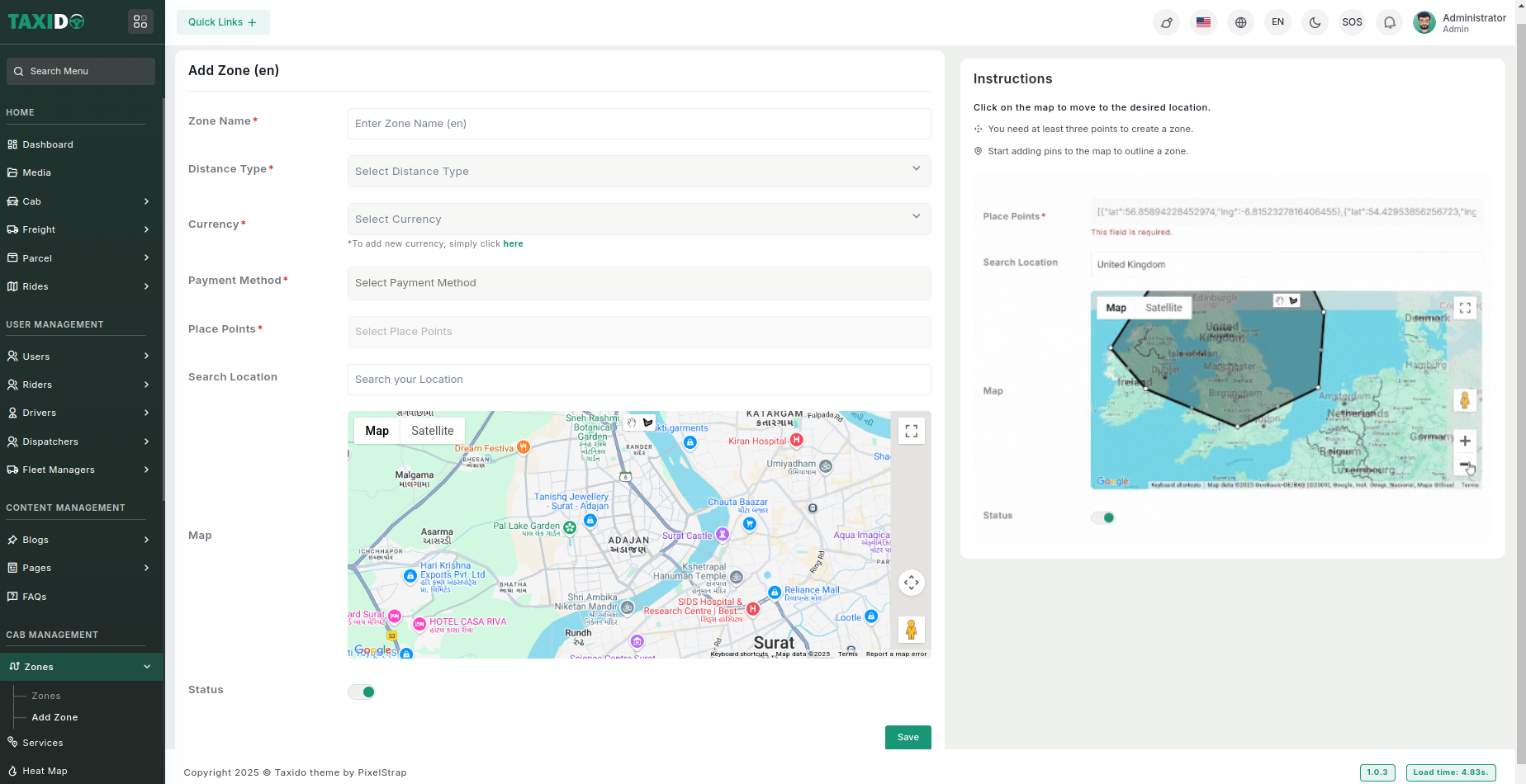 2. On the admin sidebar, find and click on the Add Zone option available under "Cab Management".